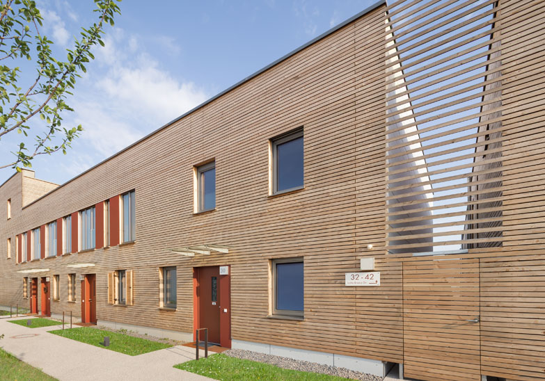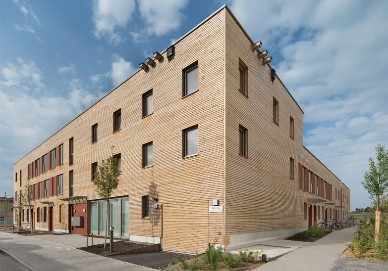 Die selbstragenden Außenwände des Gebäudes sind in Holzrahmenbauweise mit Zellulosedämmung erstellt. Die horizontale Schalung aus unbehandelter heimischer Douglasie und großzügigen Fenstern prägen die Fassade. In den Räumen sowie dem Laubengang liegt Parkettboden. Diese durchgängige Materialität ist das verbindende Element und betont die Idee des genossenschaftlichen Wohnungsbaus. Rote Faserzementplatten und Eingangselemente setzen farbliche Akzente. Das flachgeneigte Dach des mittleren Riegels ist begrünt und dient als Erholungsfläche. Auf den anderen beiden Dächern sichern Photovoltaik- und Solarthermie-Elemente in Kombination mit dem Blockheizkraftwerk den Strom- bzw. Wärmebedarf.